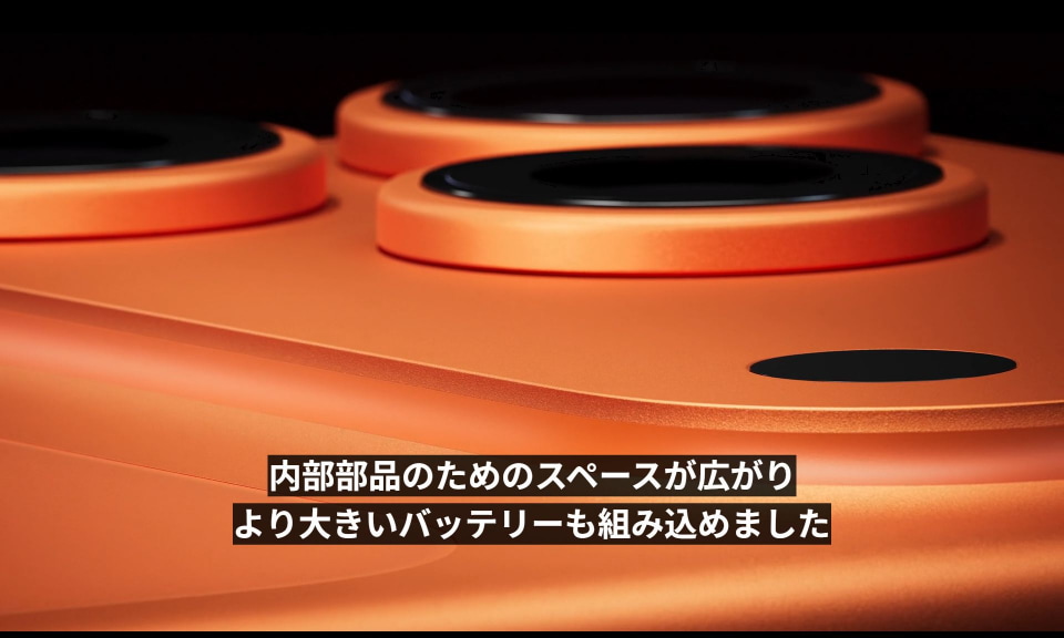 目を引く大きな「鍛造凸部」により、熱が効率的に放散されるだけでなく、内部部品のためのスペースが広がったことでより大きなバッテリーが搭載されている。凸部の外縁にはアンテナを組み込み、iPhone史上最も高性能なアンテナシステムを構築できたとうたう。