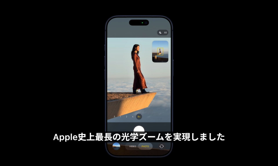 また、「48MP Fusion望遠カメラ」を凸部に格納できるよう設計された結果、100mm(4倍)の光学ズームが可能となった。48MP→12MPのクロップズームでは200mm(8倍)で、「Apple史上最長の光学ズームを実現」したという。