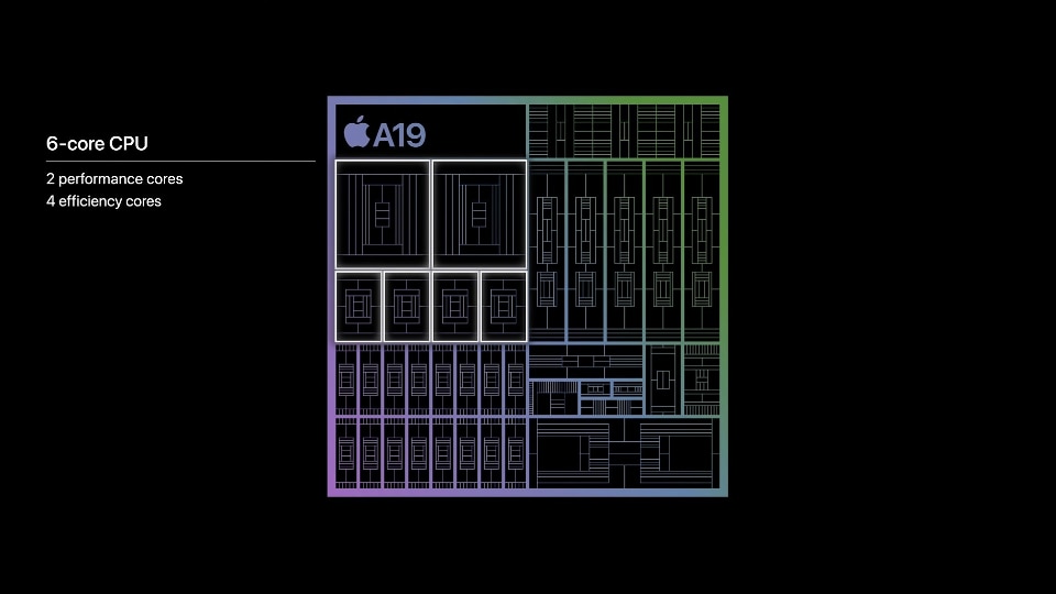 A19チップは、第3世代の3nm技術に基づいて構築され、6コアCPU、5コアGPUを備える。6コアCPUはA15 Bionicの1.5倍高速、5コアGPUはA15 Bionicの2倍以上高速。デバイス上で生成AIを実行するのにも役立つとされる。