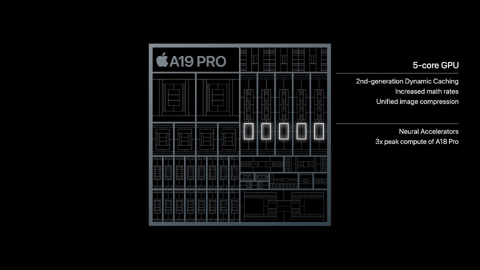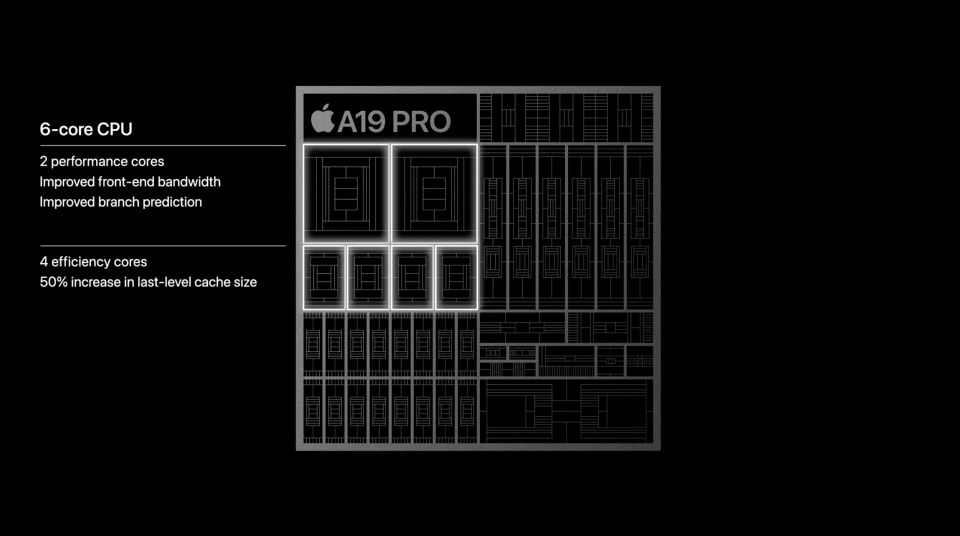 同じくA19 Proチップを搭載するiPhone 17 Pro、iPhone 17 Pro Maxだが、こちらは6コアCPUと6コアGPUを備える。各GPUコアにニューラルアクセラレータが組み込まれており、A18 Proより大きなキャッシュ、多くのメモリが含まれている。
