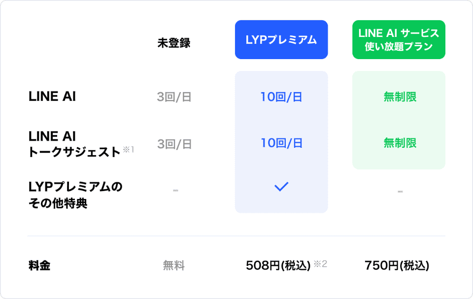 LINEヤフーは、月額制サービス「LYPプレミアム」の会員特典として、コミュニケーションアプリ「LINE」のAIサービス「LINE AI サービス」の各機能をそれぞれ1日10回まで利用できる特典を追加した。なお、未登録のユーザーは1日あたり各機能をそれぞれ3回まで無料で利用可能。