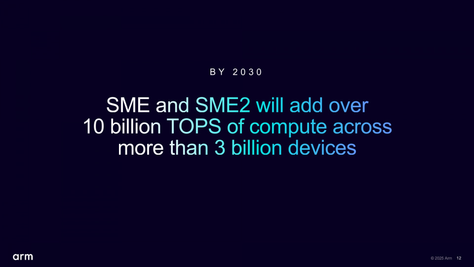 Armは2030年までにSMEとSME2を30億台以上のデバイスに展開し、100億TOPSを超える演算性能を追加すると見込んでいる。これにより、低遅延やプライバシー強化、コスト削減を実現し、ユーザー体験をさらに高めていく考え。