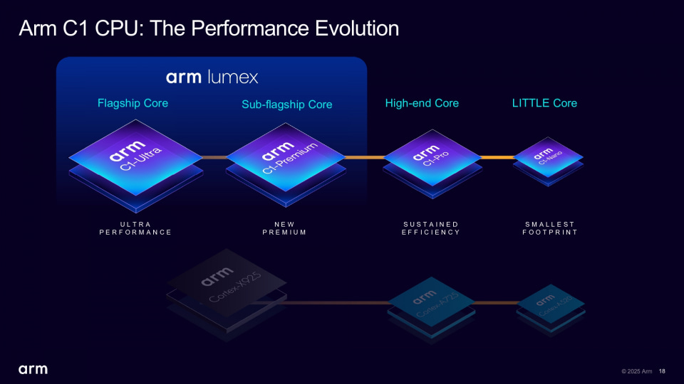 Lumexには、SME2に対応した次世代Armv9.3 CPUクラスターが搭載されており、C1-Ultra、C1-Premium、C1-Pro、C1-Nanoの4種類を用意している。