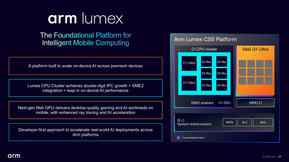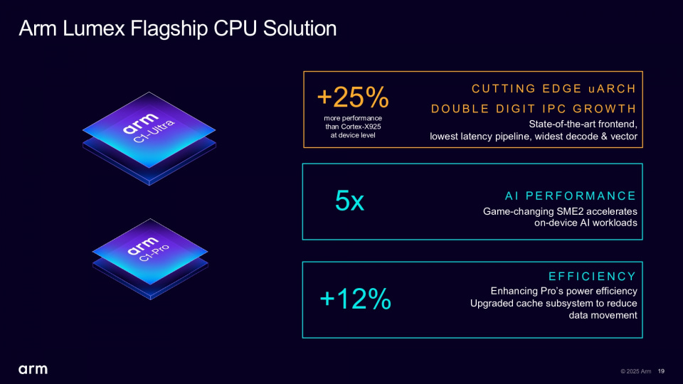 Lumexは3nmノード向けに最適化され、CPUやGPUの実装を複数ファンドリーに提供する。Lumex搭載デバイスは2025年後半に出荷予定で、まずはモバイル製品への採用が中心となる。