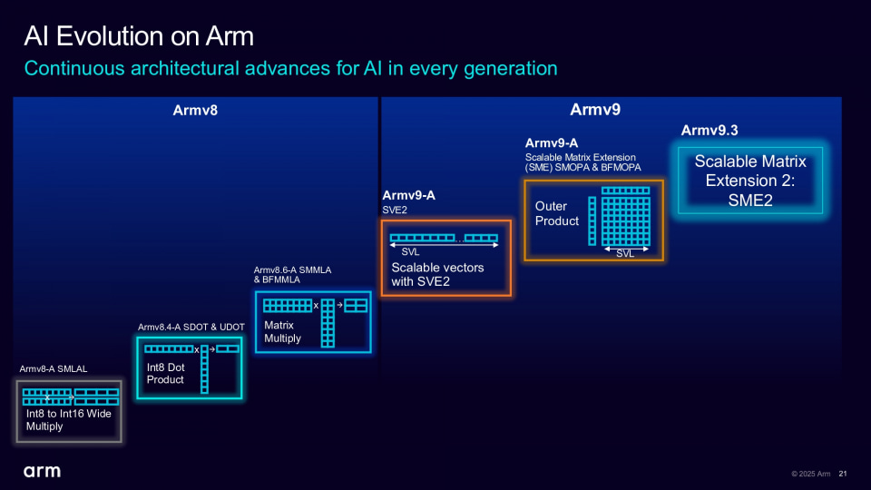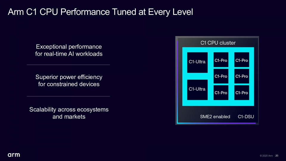これらはすべてSME2を追加可能で、Arm史上最高のAI性能を実現する。さらに電力効率に配慮したC1-DSUも提供され、スマートフォンからパソコンまで幅広いデバイスでスケーラブルに利用できる。