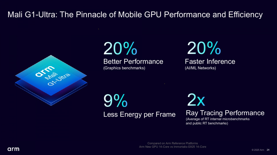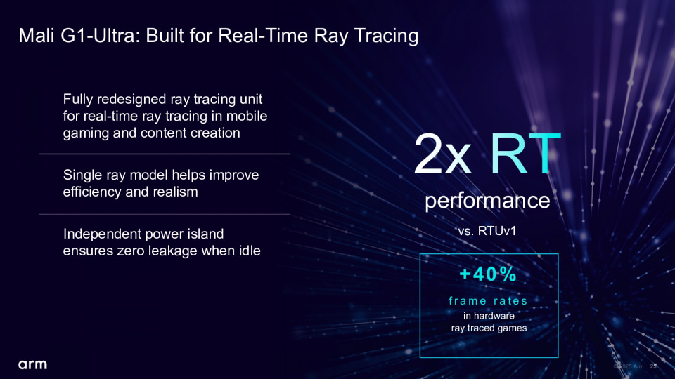 新しいMali G1-Ultra GPUは、専用のレイトレーシングユニット「RTUv2」を搭載し、前世代比で2倍の性能を実現した。最大24シェーダーコアまで対応し、電力効率にも配慮され、未使用時にはピーク電流をゼロに抑える仕組みも備えている。