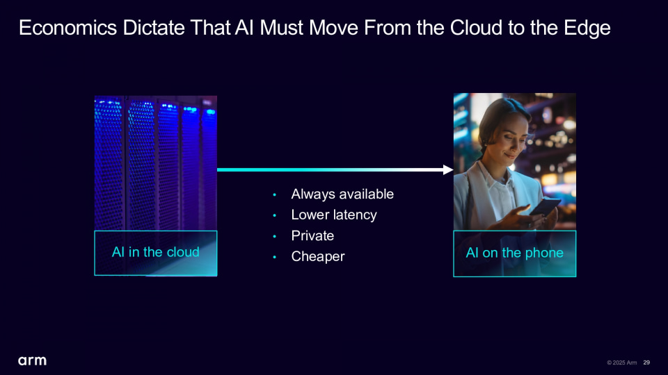 そのなかでオンデバイスAIは即時性や常時利用、プライバシー保護、低消費電力の観点から不可欠であり、クラウドAIとのハイブリッドモデルも重要になる。さらにArmは、ハードウェアにとどまらず開発者エコシステム全体におけるソフトウェアの重要性を認識し、システムレベルでの変革に応えるプラットフォーム戦略への転換を進めている。
