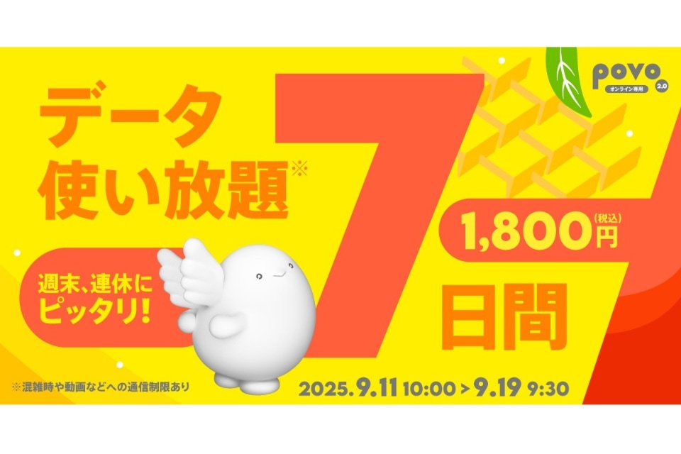 KDDIと沖縄セルラーは、オンライン専用ブランド「povo2.0」の期間限定トッピングとして、「データ使い放題(7日間)」の提供を開始した。販売期間は9月19日9時30分まで。料金は1800円。
