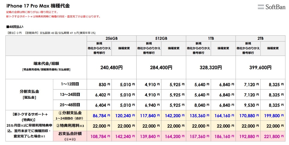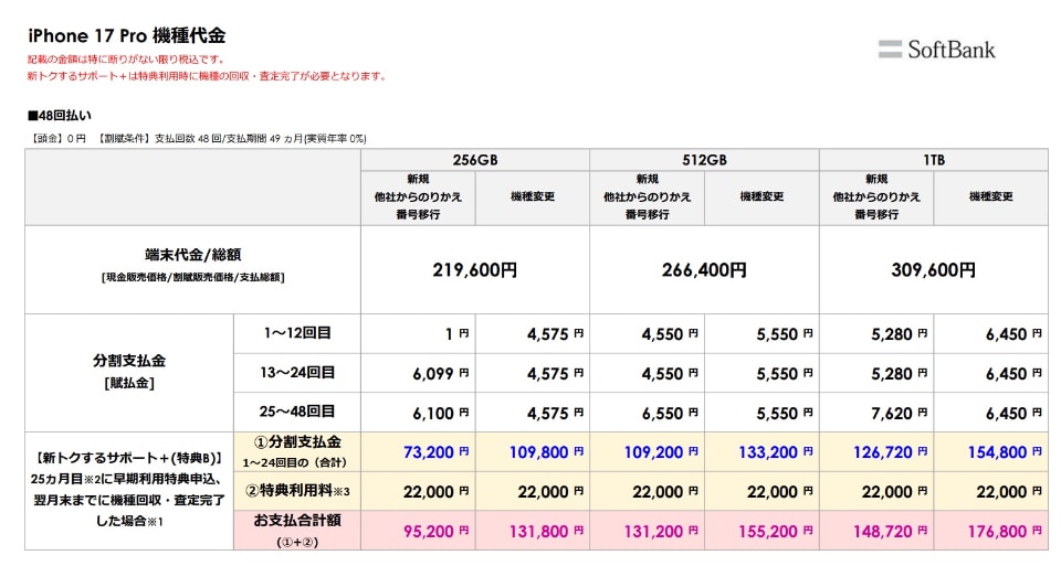 「iPhone 17」、「iPhone 17 Pro」、「iPhone 17 Pro Max」、「iPhone Air」を「新トクするサポート+(特典B)」で購入し、同特典を利用する際の特典利用料は2万2000円。特典利用料は9月12日時点の料金で、変更される場合がある。なお、ソフトバンクでは一定の条件を満たして機種変更をすると特典利用料を免除する「買替え応援割」を提供している。