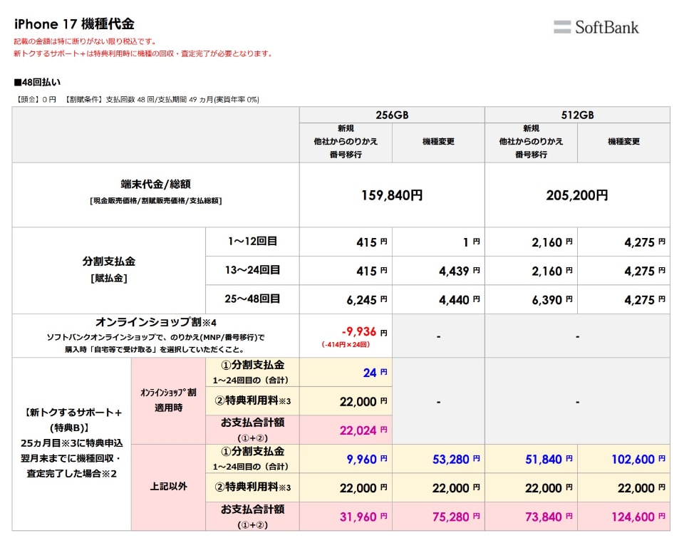 ソフトバンクは、9月19日に発売する「iPhone 17」シリーズおよび「iPhone Air」について、ソフトバンクオンラインショップでの本体価格や、新トクするサポート適用時の支払い条件などを発表した。