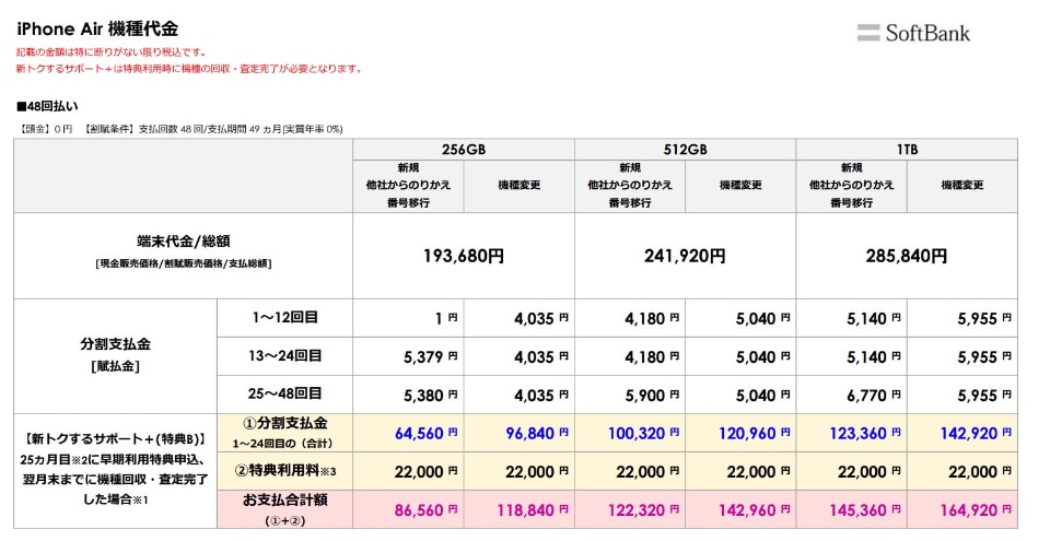 「iPhone Air」の256GBモデルの本体代金は19万3680円。新規契約、MNP契約、番号移行で契約時の1~12回目の支払い金額は月1円、13~24回目は月5379円で、負担金の合計は6万4560円、特典利用料をあわせると8万6560円。機種変更時の支払い金額は1~24回目が4035円で合計9万6840円、特典利用料とあわせると11万8840円。