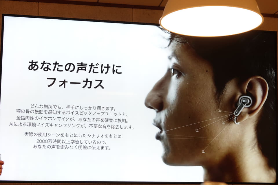「ボイスピックアップユニット」は、頬などユーザーの口周りの振動を検知し、マイクの性能向上に活かすユニット。唇や顎、頬、耳に近い部分の振動を検知し、音に変換、マイクでの集音とあわせることで、よりユーザーの声をクリアに拾えるようになる。内部では、AIを使ってさまざまなパターンと照合し出力するもので、オンデバイスAIに近い処理を行っている。