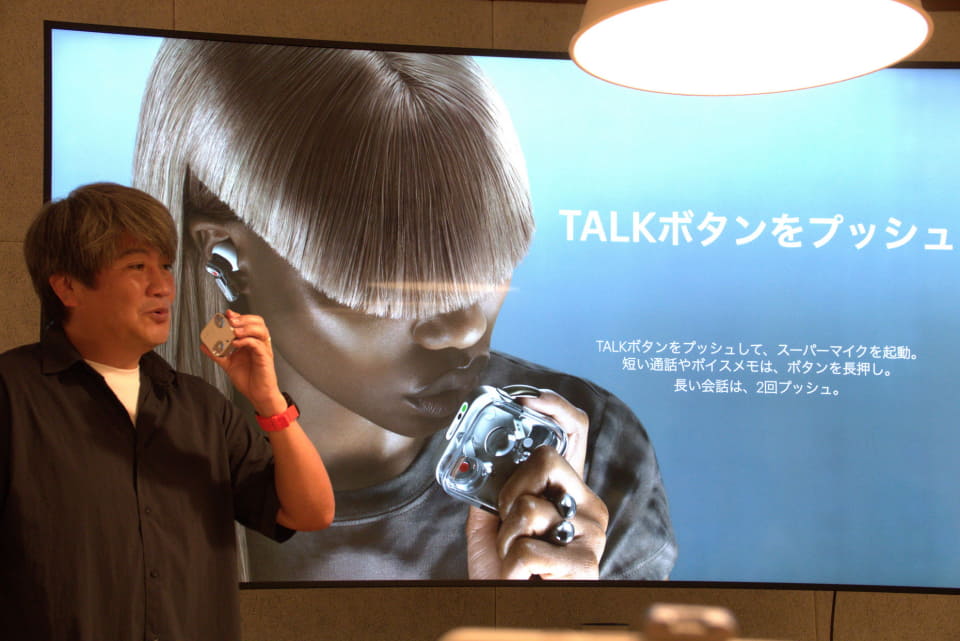 「スーパーマイク」は、充電ケースにマイクを設置し、集音性能の向上を図るもの。本体には「TALK」ボタンが備えられており、押されている間は充電ケースのマイクが増設される形で声が拾われる。TALKボタンは、ボタンを2回押すことでホールドすることもできる。