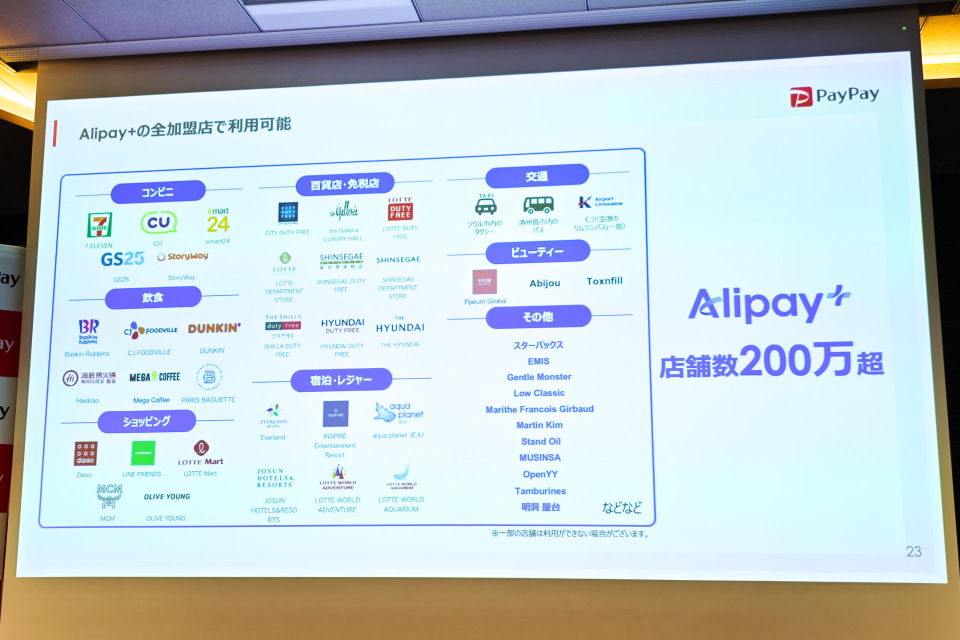 利用できる店舗は、アライアンスパートナーであるAlipay+加盟店で、200万以上の場所が対象。セブン-イレブン、CU、GS25などのコンビニ、メガコーヒーやパリスバケットといったカフェ、オリーブヤング、ロッテマート、ダイソーなどのショッピング施設、ロッテや新世界、現代といった百貨店、ロッテワールドなどのレジャー施設、さらにはソウル市内のタクシーでも使える。特に、クレジットカードが使えない明洞の屋台でもQRコード決済ができる点が強調された。