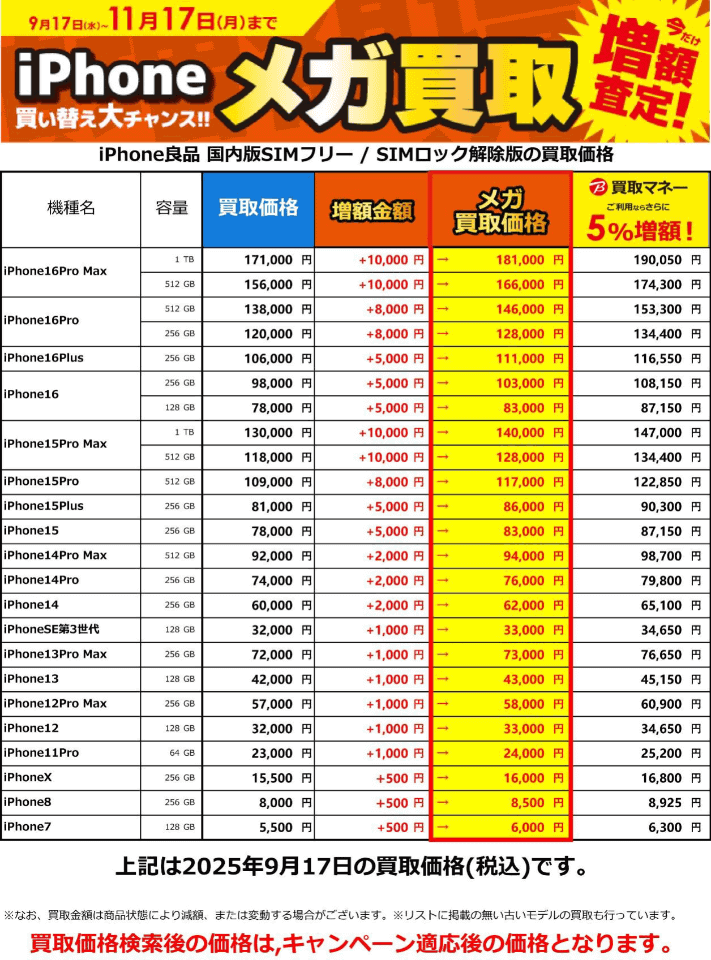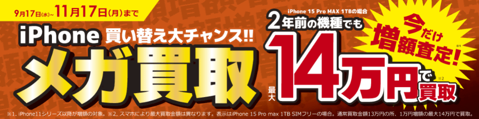 ビックカメラとコジマ、ソフマップは17日、iPhoneの買取金額を最大1万円増額する「iPhone メガ買取」キャンペーンを開始した。期間は11月17日まで。全国の買取カウンターと買取アプリ「ラクウル」で開催されている。