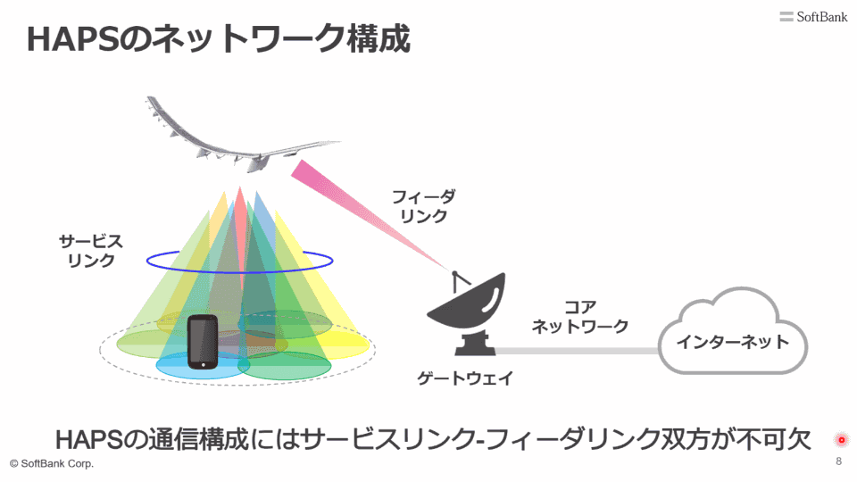 HAPSは、地上からの電波をHAPS経由で送受信するようなイメージでサービスを提供する。インターネットに接続されているコアネットワークは、通常地上の基地局と繋がり、基地局からユーザーのデバイスと電波で接続しサービスを提供する。HAPSでは、コアネットワークで接続された「ゲートウェイ」とHAPSがまず電波で接続され、今度はHAPSとデバイスが電波で接続される。