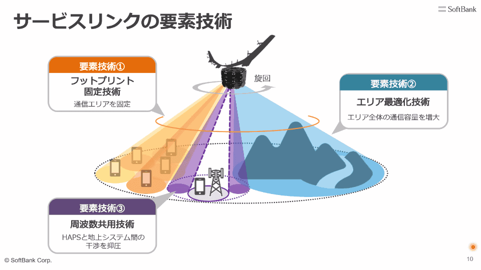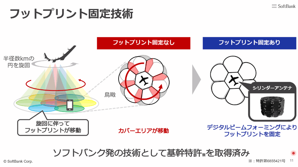 まずは、動く基地局から地上の通信エリアを固定する「フットプリント固定技術」。通常、飛行機は旋回しながら上空を飛行するため、上空の装置からカバーしているエリアが旋回に合わせて移動してしまう。通常、通信エリアはいくつかのセルと呼ばれる単位で分けてカバーしているため、旋回している状態では、地上の1地点でセルがコロコロ変わってしまい、安定した通信ができない。