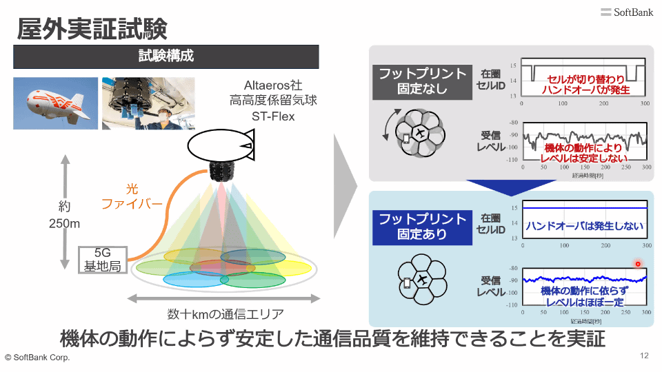 フットプリント固定とは、旋回に伴うこれらの移動を、デジタルビームフォーミングで固定するもの。同社は、フットプリント固定技術を開発し、基幹特許を取得。実証実験でも安定した通信を維持できることを確認している。