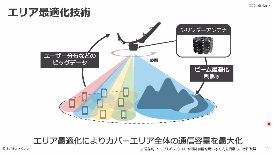 HAPSでも、同様の取り組みを進めている。たとえば、地上のどのあたりにユーザーが多くいるか? といったビッグデータを活用し、エリアにあわせた通信を実施。データが少ないエリアでは、デバイスの位置にあわせてエリアを最適化することで、全体の通信容量を最大化する「エリア最適化技術」を開発した。