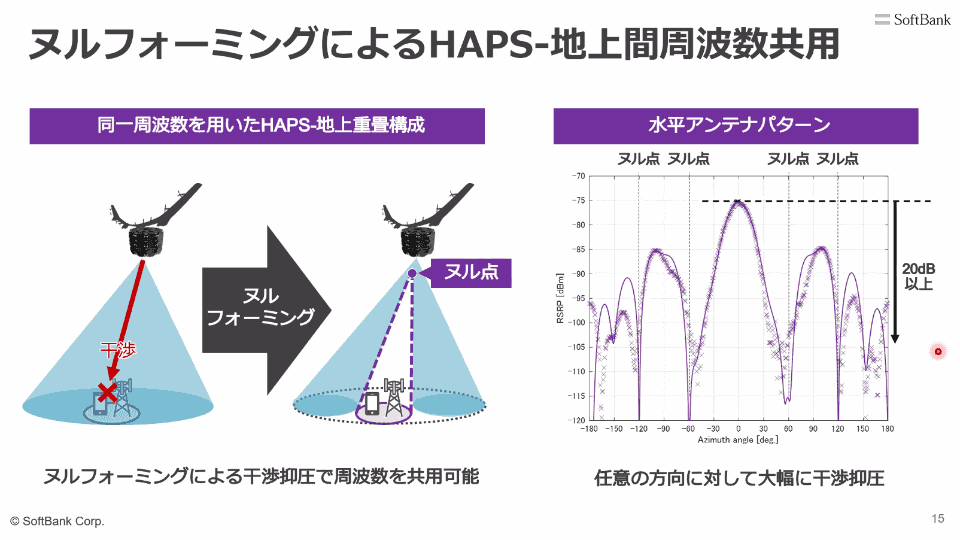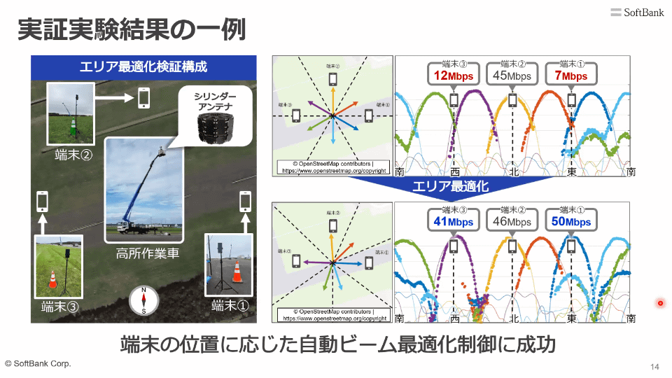 具体的には、HAPSに設置されるシリンダーアンテナから発射される電波について、デバイスの場所に応じて自動ビーム最適化制御を実施。電波の境目にあるデバイスに対しても通信速度の最大化を図る。