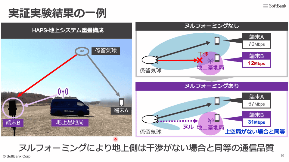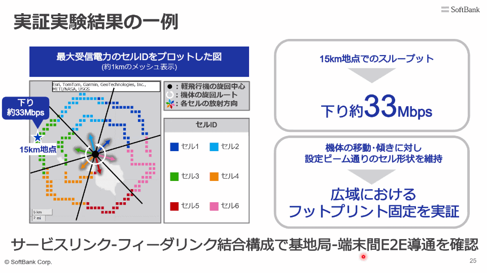結果、エリアの端でのスループットが下りで約33Mbpsを達成したほか、広域でのフットプリント固定を実証できた。これにより、サービスリンクとフィーダリンクの結合構成による大容量通信ペイロードの開発が完了した。