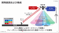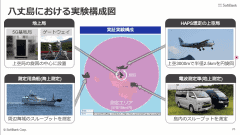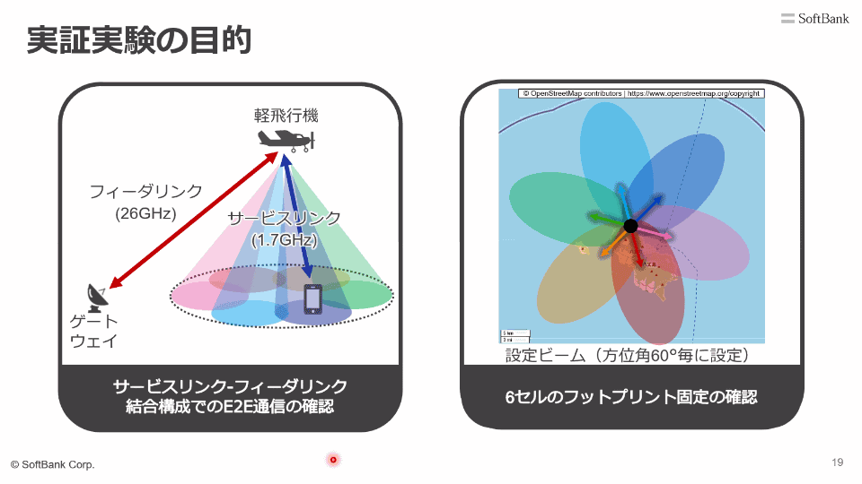 フィーダリンク側では、旋回する軽飛行機と安定して通信するため、移動による変異を補正する「ドップラーシフト補正受信レベル補償」を上空側に、アンテナを回転させて機体を動的追尾する「ビームトラッキング技術」を搭載。地上と海上にまたがる、半径15kmという円内の測定エリアで実証した。