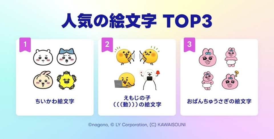 また、5月29日から8月29日に集計された人気絵文字トップ3は、1位が「ちいかわ絵文字」、2位が「えもじの子(((動)))の絵文字」、3位が「おぱんちゅうさぎの絵文字」という結果だった。