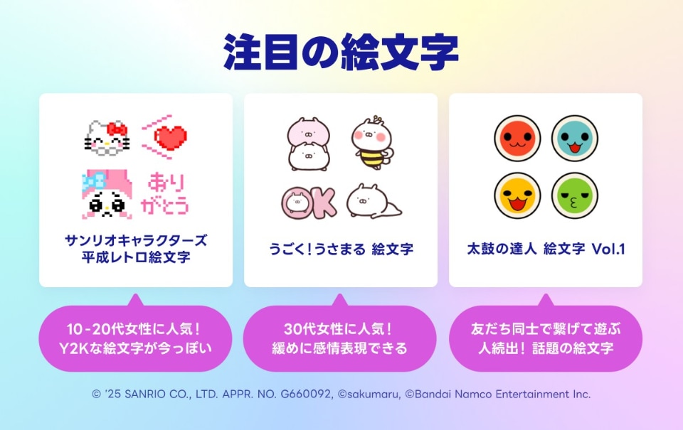 同社は、そのほかにも年代や利用シーンに応じた使い分けが活発になっている「絵文字パッケージ」を挙げる。たとえば、「サンリオキャラクターズ 平成レトロ絵文字」は10~20代女性から好評。「うごく!うさまる 絵文字」は30代女性に人気。「太鼓の達人 絵文字 Vol.1」は友だち同士でのリアクションや遊び用途に人気だと説明する。