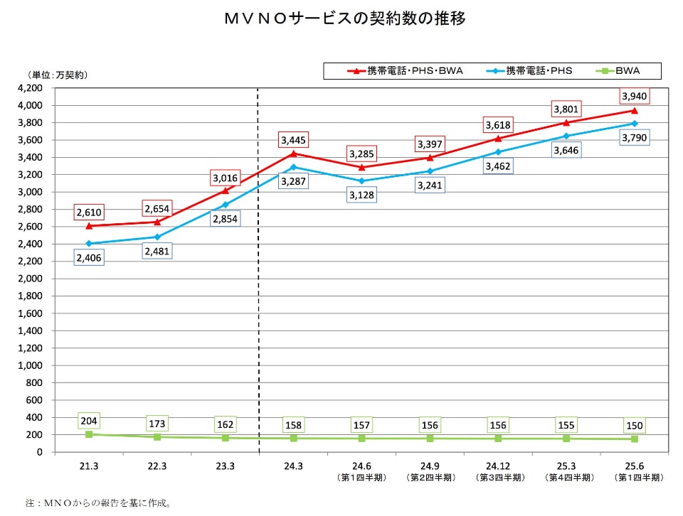 3G契約数は432万件で前期比-14%、前年同期比-35%となった。3Gサービスは国内でNTTドコモのみが提供しているが2026年3月末に終了予定。