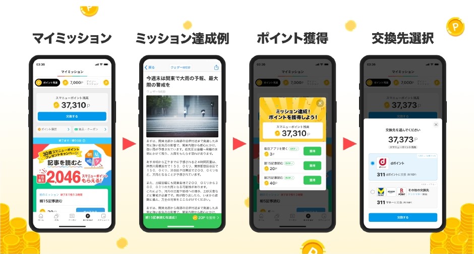 獲得したポイントは、dポイントに直接交換できるほか、SmartNewsアプリ内からポイント交換サービス「ドットマネー」を経由し、Amazonギフトカードや楽天ポイント、PayPayマネーライト、Pontaポイント、Vポイントなどに交換できる。