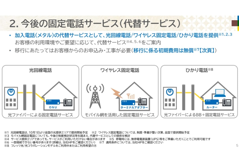 加入電話の代替サービスとして、「光回線電話」「ワイヤレス固定電話」「ひかり電話」を提供する。いずれもIP電話サービス。「光回線電話」は全国の「フレッツ光」提供エリアで10月1日に提供開始予定で、「ワイヤレス固定電話」は準備が整い次第、全国で提供開始予定。モバイル網固定電話についても、今後の制度検討状況などを踏まえ、モバイルサービス提供事業者から代替サービスとしての提供を検討中としている。
