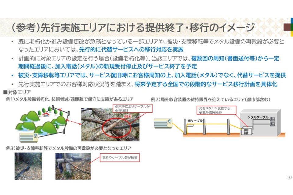 既に老朽化が進み設備更新が急務となっている一部エリアや、被災・NTT東日本の電柱の移転などでメタル設備の再敷設が必要となるエリアにおいては、先行的に代替サービスへの移行対応を実施する。