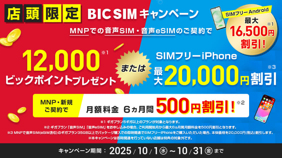 10月31日までの期間中、全国のBIC SIM取扱店で、対象の料金プランを他社からの乗り換え(MNP転入)で契約すると、最大2万円分の特典が進呈される。