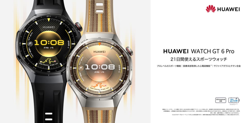 「HUAWEI WATCH GT 6」と「HUAWEI WATCH GT 6 Pro」の2モデルがラインアップされる。価格はそれぞれ3万3800円~と4万8180円~。iPhoneとAndroidスマートフォンと接続して使用できる。