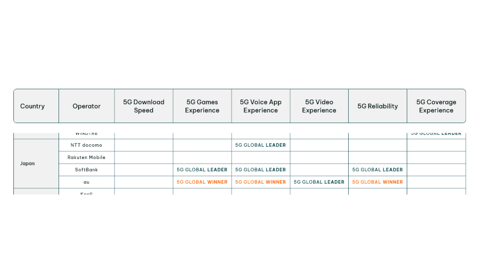 日本からは、auが「5Gゲーム体験」「5G信頼性」「5G音声アプリ体験」で「Global Winner」を獲得。さらに「5Gビデオ体験」でも「Global Leader」に選ばれた。