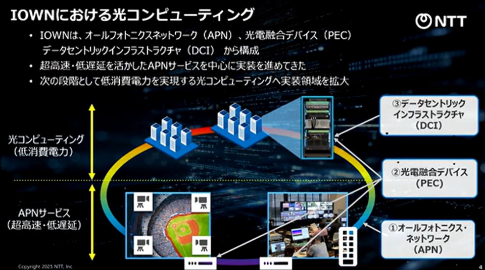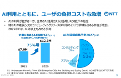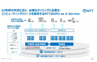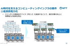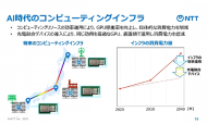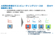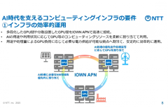 コストに占める大部分はデータセンターやGPU、ネットワークなどAI利用を支えるインフラ。大西氏は「インフラの効率的な運用」「インフラを構成する消費電力低減」とインフラに求められる要件を示す。IOWNの技術はこうした需要に応えられる。上述の光電融合スイッチは、そのひとつ。ほかにも、分散配置されたGPUを「IOWN APN」(APN=All Photonics Network)で結ぶことで、AIの用途・利用状況に応じてリソースを配分したり、GPU負荷に応じて必要な電力供給が可能な拠点へ割り当て、安定的かつ効率的な運用ができる。