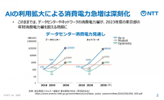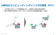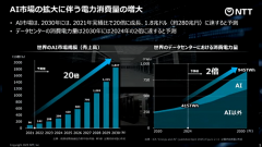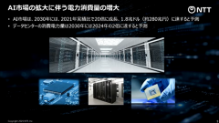 AIに対するニーズが増加するとともに、増大する消費電力への対応は急務となっている。NTTでは、IOWNにより電気的な通信を光に置き換えることで、電力問題の課題解決を図る。