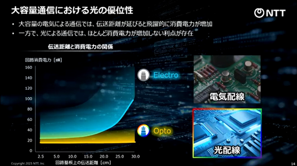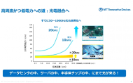 NTTイノベーティブデバイスでは、2026年にもデータセンターの基盤と基盤をつなぐデバイスの商用展開を目指す。現在、銅線ケーブルを介して電気により接続されている仕組みを光で結ぶ仕組みに置き換える。102.4Tbpsの容量を持ち、スイッチ単体で50%の電力を削減するという。