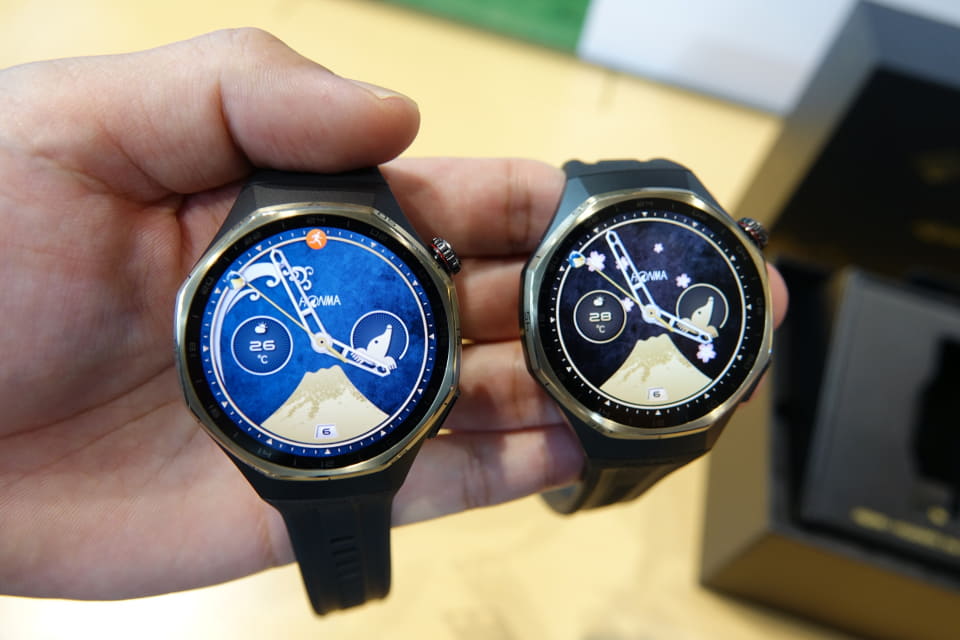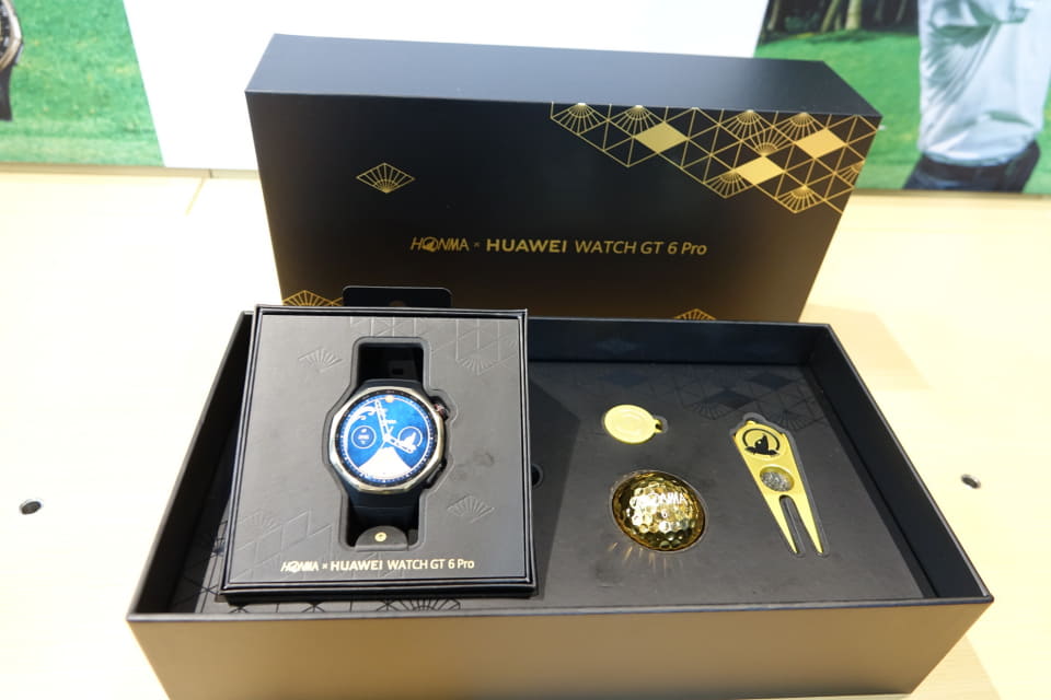 ゴルフ機能が充実している「HUAWEI WATCH GT 6 Pro」と、ゴルフ用品の総合メーカー「本間ゴルフ」がコラボレーションしたモデル「HONMA×HUAWEI WATCH GT 6 Pro」(以下本間モデル)が登場する。本間モデルでは、独自のデザインとウォッチフェイスが採用されている。バックルには本間ゴルフのロゴが描かれたり、本間ゴルフの限定クラブ「BERES 7S」をイメージしたウォッチフェイスが用意されていたりする。