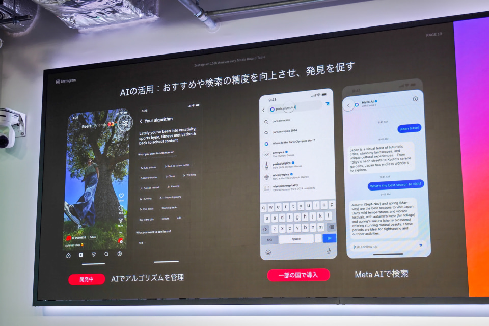 今後のInstagramの中核となるのはAI。Metaは大規模言語モデル「Llama」や「Meta AI」、AIスマートグラスなどの開発を進めており、InstagramでもAIによる体験向上が重点的に進められている。主な取り組みは、レコメンドの精度向上、広告効果の改善、クリエイティブツールの強化の3分野。