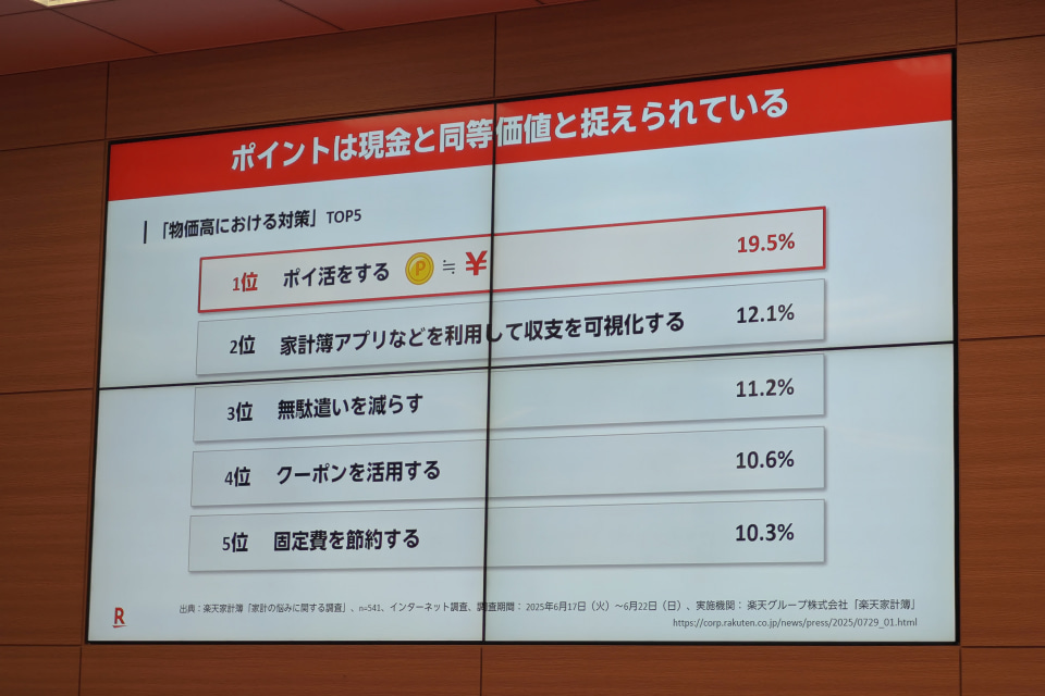 特に近年は物価高が長引く一方で、給与の伸びが鈍い経済環境が続いており、「家計のやりくりが大変」と感じる家庭が増えている。こうした中で、家計管理や資産形成への関心は年々高まっている。楽天が提供する家計管理アプリ「楽天家計簿」が6月に実施した調査では、物価高対策として「投資をする」と答えた人が、「収支の可視化」や「クーポン活用」を上回り最も多い結果となった。ポイントが今や現金と同じように、家計を支える重要な資産価値として認識されていることがうかがえる。