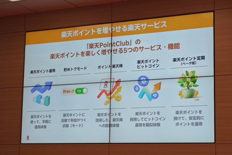 楽天グループは、「楽天PointClub」を通じて、ポイントを“ポイントのまま”増やせる5つのサービスを提供している。