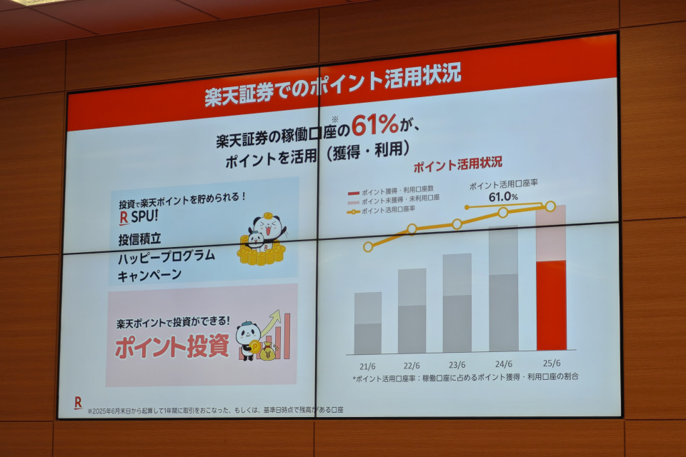 楽天証券では、クレカ決済や楽天キャッシュによる投信積立などでポイントを貯めることもでき、貯める・使う・運用するのサイクルを1つのプラットフォームで完結できる。実際に、同社で投資を行うユーザーの約6割がポイントを使って投資しており、ポイントと投資の相性の良さが表れている。