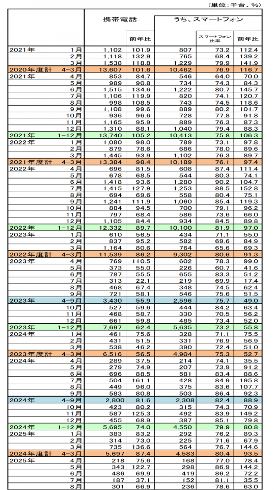 電子情報技術産業協会(JEITA)と情報通信ネットワーク産業協会(CIAJ)は、2025年8月の携帯電話出荷台数を公表した。スマートフォンの出荷台数は23万6000台で、前年同月比63%だった。