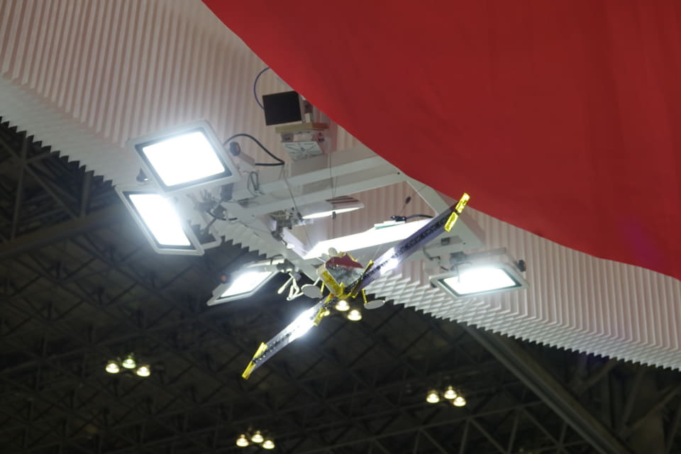 会場では、実際に5G NTN通信としてブースセットの上にある模擬衛星から11GHz帯の電波を使って地上側のターミナルへデータを送信するデモンストレーションが確認できる。デモでは、この電波でリアルタイムの映像を送受信しており、近くにある重機の模型を遠隔で操縦する体験ができる。