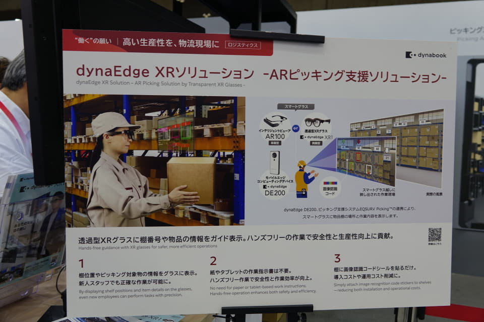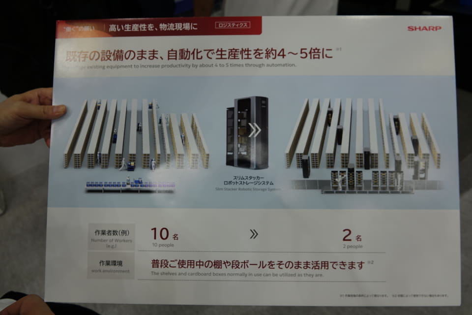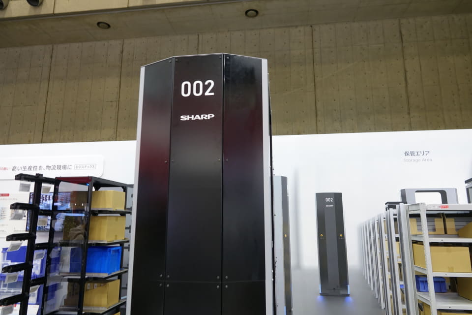 狭い通路など、従来の倉庫でも利用できる「スリムスタッカー・ロボットストレージシステム」が大きく展示されている。本体幅を700mmに抑えることで、倉庫内の狭い通路でも対応でき、さまざまな形状の荷物を棚からピックアップし、作業者まで自動で運搬する。
