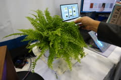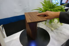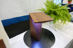 素材やデザインを工夫すれば、インテリアにも活用できる。同社と家具メーカーのマルニ木工、そしてデザイナーの川崎富美氏による、木材の表面を触るだけで照度が変わるスタンドライトが展示されている。このほか、自動車のアームレストにセンサーを設置すれば、クッション性や肌触りをそのままにタッチセンサー化することができる。素材の裏側から光を当ててインターフェイスを表示させることもでき、さまざまなプロダクトに応用可能。植物のプランターの下にセンサーを設置すれば、植物の水を伝って検知させることもできる。