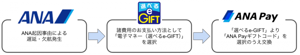 受け取った人が任意の電子マネーやポイントなどに交換できる「選べるe-GIFT」の交換先としてもANA Payギフトコードを選べる。12月ごろからは、全日空便が遅延・欠航した場合に受けられる、諸費用の支払方法としても選択できるようになる。