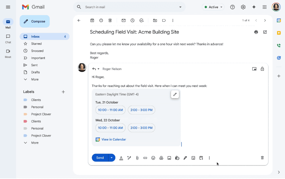 たとえば、「会議の時間をいつにするか?」のメールに返信しようとすると、Gmailのツールバーに「スケジュール設定を手伝う」ボタンが表示される。選択すると、GeminiがユーザーのGoogleカレンダーとメールの内容を分析して、会議の時間を提案し、返信メールにも時間の候補が直接記載される。