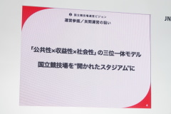 JNSEを設立した企業の1社にはNTTドコモが含まれる。同社 代表取締役社長の前田義晃氏は、国立競技場はこれまで公共性を重視する運営がなされてきたとしたうえで「民間(JNSE)が主体となることで、その歩みを受け継ぎながらより柔軟かつ創造的に価値を生み出し、社会に還元できる」と、今後への期待感を示す。